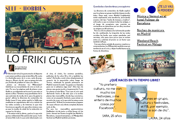 ¿Cómo se divierten los Millennials? Satisfacer sus necesidades de ocio es todo un reto. Por eso, las páginas web de planes como Kedin.es, se esfuerzan en buscar lo que más se ajusta a ellos: “Estamos muy pendientes de lo que está más de moda, de lo que a la gente le gusta”, afirma la directora de contenidos de Kedin, Laura S. Lara, quien explicó a Selfie que mediante un seguimiento del ocio a través de las redes sociales y de internet, lo que más funciona es aquello a lo que ellos mismos van, ya que la media de edad de la redacción no supera los 30 años.