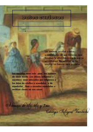 Las escuelas eran solo para los varones de clase media .Los chicos indígenas y mestizos eran educados por religiosos y los hijos de criollos a acaudalos o de españoles , iban a escuelas especiales o recibían clases en sus casas