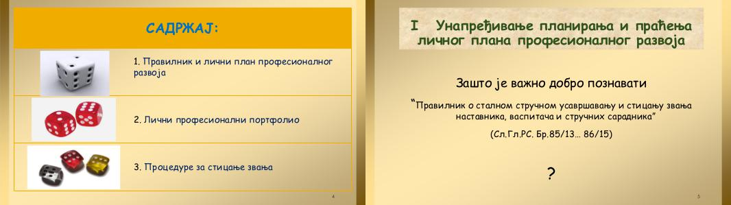 САДРЖАЈ: 1. Правилник и лични план професионалног развоја 2. Лични професионални портфолио 3. Процедуре за стицање звања 4