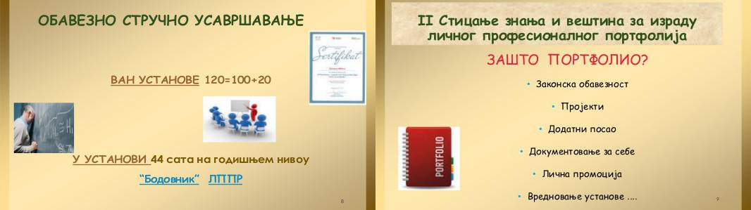 II Стицање знања и вештина за израду личног професионалног портфолија ЗАШТО ПОРТФОЛИО? • Законска обавезност • Пројекти • Додатни посао • Документовање за себе • Лична промоција • Вредновање установе .... 9