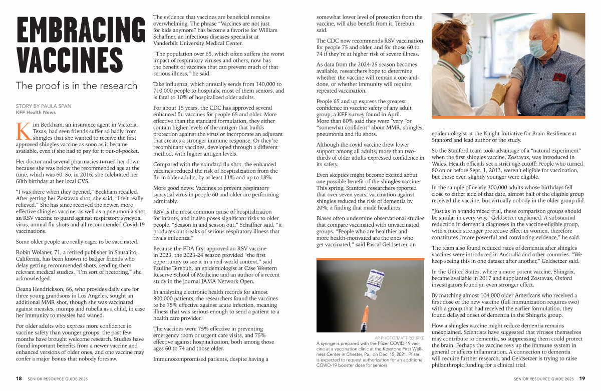 For older adults who express more confidence in vaccine safety than younger groups, the past few months have brought welcome research. Studies have found important benefits from a newer vaccine and enhanced versions of older ones, and one vaccine may confer a major bonus that nobody foresaw.