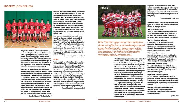 Overall , it was a hugely successful season and another massive step in a positive direction for rugby at Sevenoaks School . From an Upper School perspective , a tremendous number of students chose rugby in the Michaelmas term . This depth of interest has helped to drive successful seasons for both 1st and 2nd XV . Over the last three years , I have seen a growing bond between Upper and Lower Sixth ; this has helped on and off the field in developing better relations and driving performances . There were many highs throughout the year , one of which will live long in the memory : we smashed rivals King ’ s Canterbury 37-7 , a game where every single player wore their heart on their sleeve and fought to win every collision . The second team experienced a tough start to the season . However , a resilient and hardworking approach provided the building blocks to overturning their fortunes . This led to achieving memorable victories over our arch-rivals , King ’ s Canterbury and Christ ’ s Hospital .