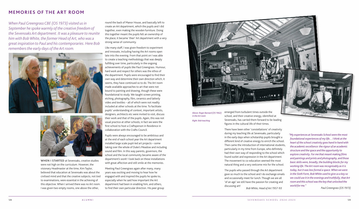 When Paul Greengrass CBE( OS 1973) visited us in September he spoke warmly of the creative freedom of the Sevenoaks Art department. It was a pleasure to reunite him with Bob White, the former Head of Art, who was a great inspiration to Paul and his contemporaries. Here Bob remembers the early days of the Art room.