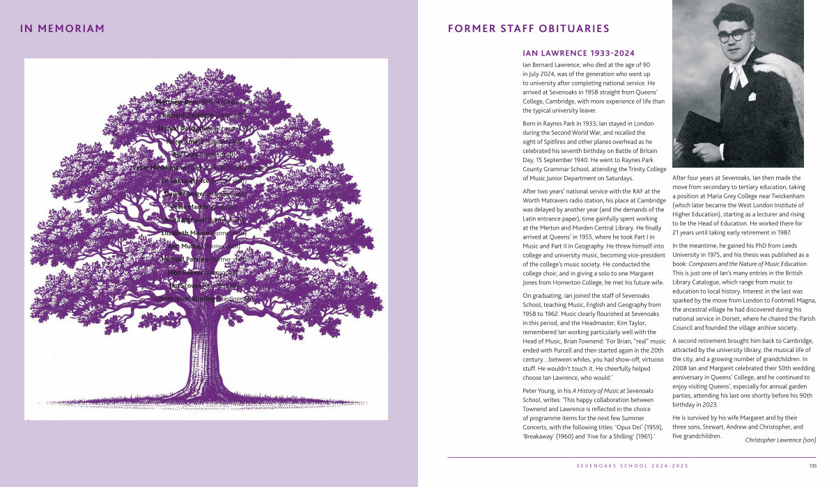 Ian Bernard Lawrence, who died at the age of 90 in July 2024, was of the generation who went up to university after completing national service. He arrived at Sevenoaks in 1958 straight from Queens’ College, Cambridge, with more experience of life than the typical university leaver.
