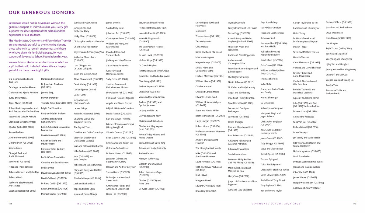 The Headmaster, Governors and Foundation Trustees are enormously grateful to the following donors, those who wish to remain anonymous and those who have given via fundraising pages, for your support of Sevenoaks School Foundation this year.