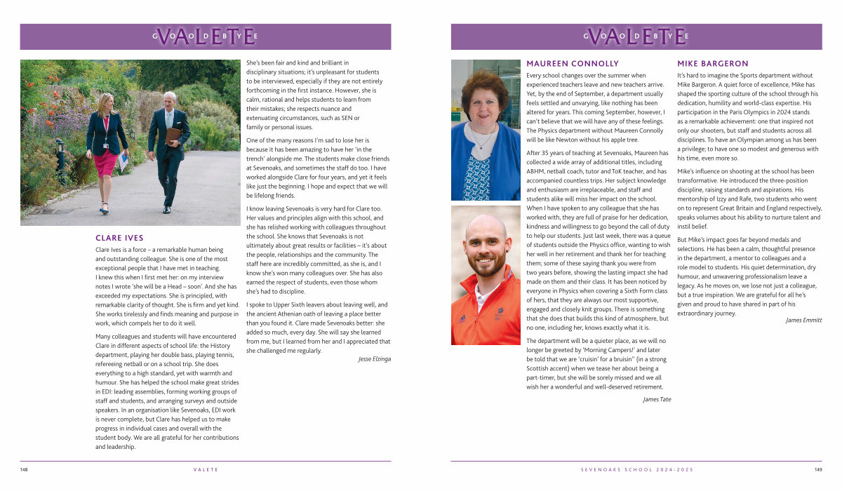 After 35 years of teaching at Sevenoaks, Maureen has collected a wide array of additional titles, including ABHM, netball coach, tutor and ToK teacher, and has accompanied countless trips. Her subject knowledge and enthusiasm are irreplaceable, and staff and students alike will miss her impact on the school. When I have spoken to any colleague that she has worked with, they are full of praise for her dedication, kindness and willingness to go beyond the call of duty to help our students. Just last week, there was a queue of students outside the Physics office, wanting to wish her well in her retirement and thank her for teaching them; some of these saying thank you were from two years before, showing the lasting impact she had made on them and their class. It has been noticed by everyone in Physics when covering a Sixth Form class of hers, that they are always our most supportive, engaged and closely knit groups. There is something that she does that builds this kind of atmosphere, but no one, including her, knows exactly what it is.
