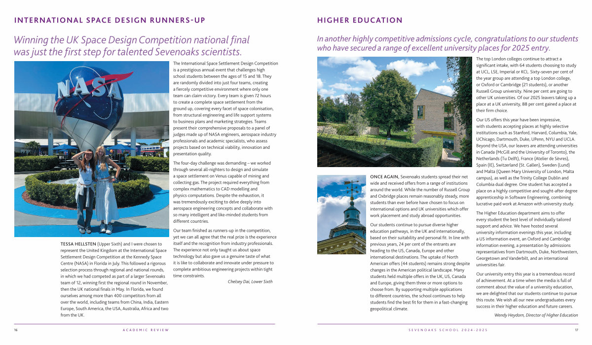 ONCE AGAIN, Sevenoaks students spread their net wide and received offers from a range of institutions around the world. While the number of Russell Group and Oxbridge places remain reasonably steady, more students than ever before have chosen to focus on international options and UK universities which offer work placement and study abroad opportunities.