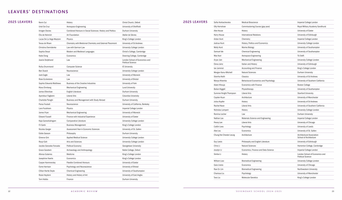 Rufus Drummond Computer Science IE University Ben Dueck Neuroscience University College London Jack Eagle Law University of Warwick Rose Ecclestone Law University of Bristol Sophie Edwards Matthews Business of the Creative Industries University of York Klara Ehrnborg Mechanical Engineering Lund University James Ellershaw English Literature Durham University Ayomikun Fagbemi Liberal Arts Columbia University Charlotte Flenghi Business and Management with Study Abroad Durham University Parsa Fouladi Neuroscience University of California, Berkeley Lara Foulsham Physics Imperial College London James Fryer Mechanical Engineering University of Warwick Edward Fussell Finance with Industrial Experience University of Exeter Kaja Ganeshalingam Comparative Literature University College London Fil Garbi Business Management King’ s College London Nicolas Garger Assessment Year in Economic Sciences University of St. Gallen Eddie Geeson Philosophy Durham University Ginevra Gini Applied Medical Science University College London Rouyi Goh Arts and Sciences University College London Jacobo Gonzalez Forcada Political Economy Georgetown University Grace Goodwin Archaeology and Anthropology Keble College, Oxford Afonso Guterres Medicine King’ s College London Josephine Haerle Economics King’ s College London Casper Hammersley Flexible Combined Honours University of Exeter Esme Harrison Psychology and Neuroscience University of Bristol Cillian Hartle Doyle Chemical Engineering University of Southampton Rosie Heydorn History and History of Art University of East Anglia Tom Hobbs Finance Durham University
