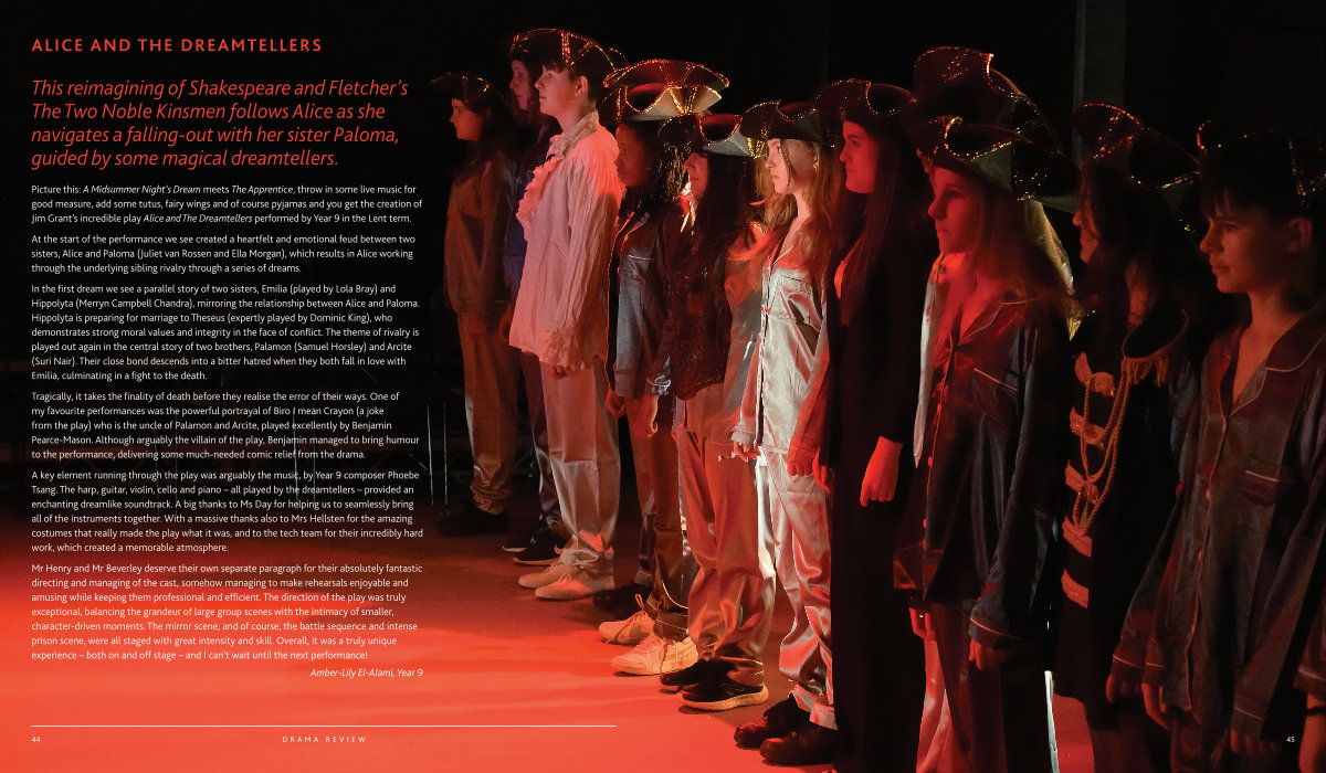 Picture this: A Midsummer Night’ s Dream meets The Apprentice, throw in some live music for good measure, add some tutus, fairy wings and of course pyjamas and you get the creation of Jim Grant’ s incredible play Alice and The Dreamtellers performed by Year 9 in the Lent term.