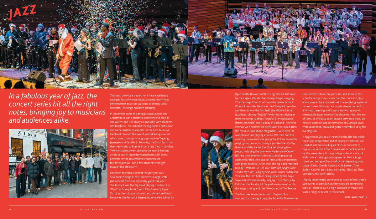 In December came the annual classic, Crash into Christmas. It was a fantastic experience to play in and watch, and it is always a favourite with students and teachers. This included the Big Band, Crash Choir and some smaller ensembles. In the Lent term, we had Music Around the World, a fundraising concert which gave us songs in languages such as Tagalog, Japanese and Kazakh. In February, the Sixth Form had their yearly trip to Ronnie Scott’ s Jazz Club in London. Twenty students went along to the world-famous venue to watch legendary saxophonist Bill Evans perform. It was an awesome chance to see top-level jazz live, and a few students even got to meet Bill afterwards.