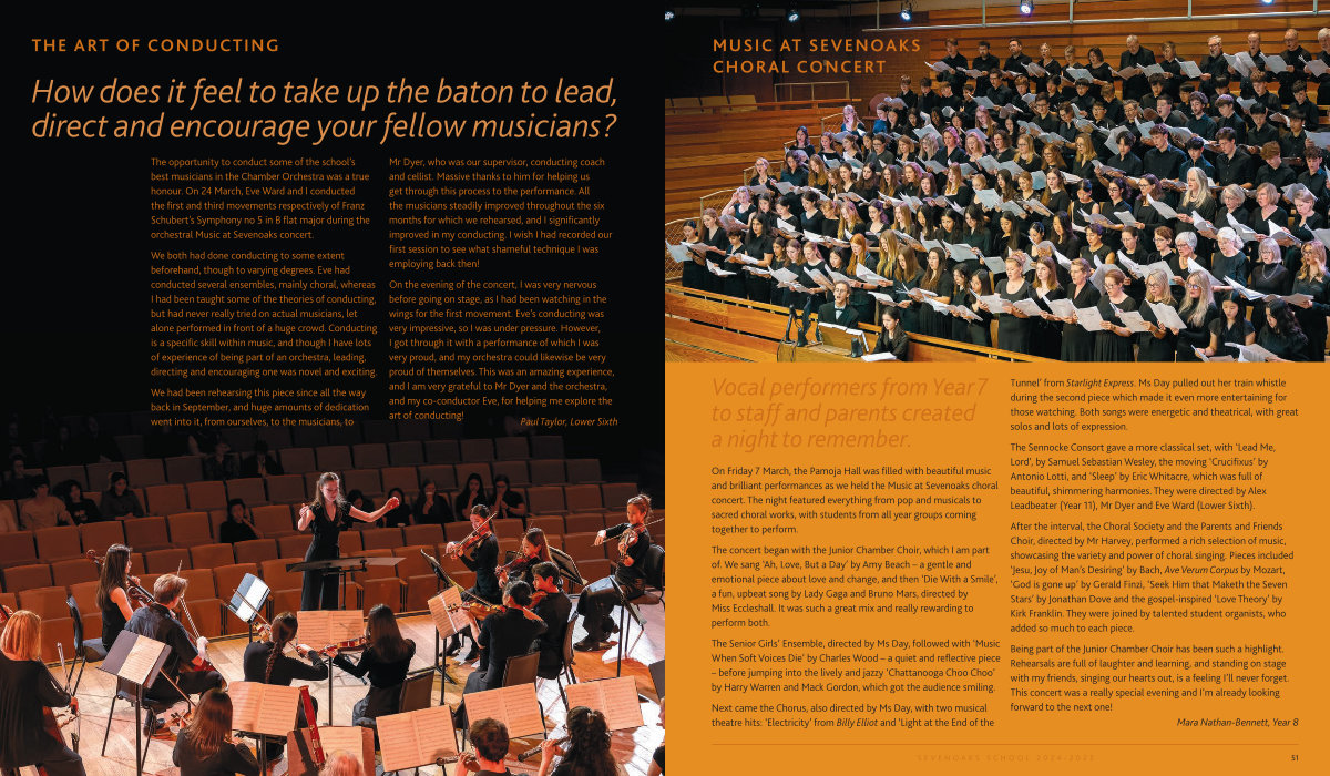 The opportunity to conduct some of the school’ s best musicians in the Chamber Orchestra was a true honour. On 24 March, Eve Ward and I conducted the first and third movements respectively of Franz Schubert’ s Symphony no 5 in B flat major during the orchestral Music at Sevenoaks concert.