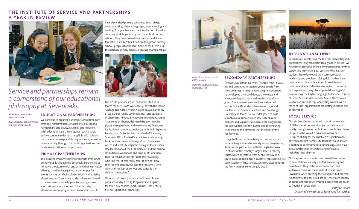 Sevenoaks students have made a real impact beyond our borders this year, both virtually and in person. We now have successful online conversation programmes supporting learners in Bali, Laos and Ukraine. Our students have developed their communication, leadership and problem-solving skills as they have built relationships with learners from different cultures and found effective strategies to converse and explain the many challenges of decoding and pronouncing the English language. In October, a group of Lower Sixth students visited South Africa on our Global Partnerships trip, where they worked with a range of local organisations promoting inclusion and conservation.