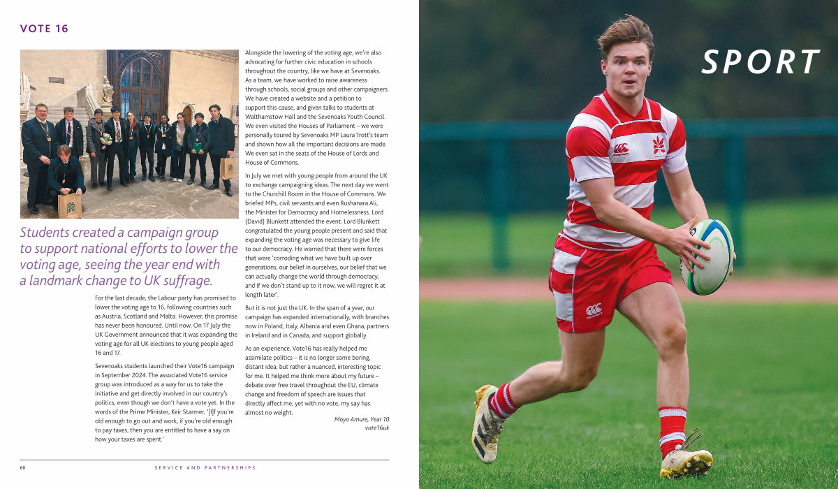 Sevenoaks students launched their Vote16 campaign in September 2024. The associated Vote16 service group was introduced as a way for us to take the initiative and get directly involved in our country’ s politics, even though we don’ t have a vote yet. In the words of the Prime Minister, Keir Starmer,‘[ I ] f you’ re old enough to go out and work, if you’ re old enough to pay taxes, then you are entitled to have a say on how your taxes are spent.’