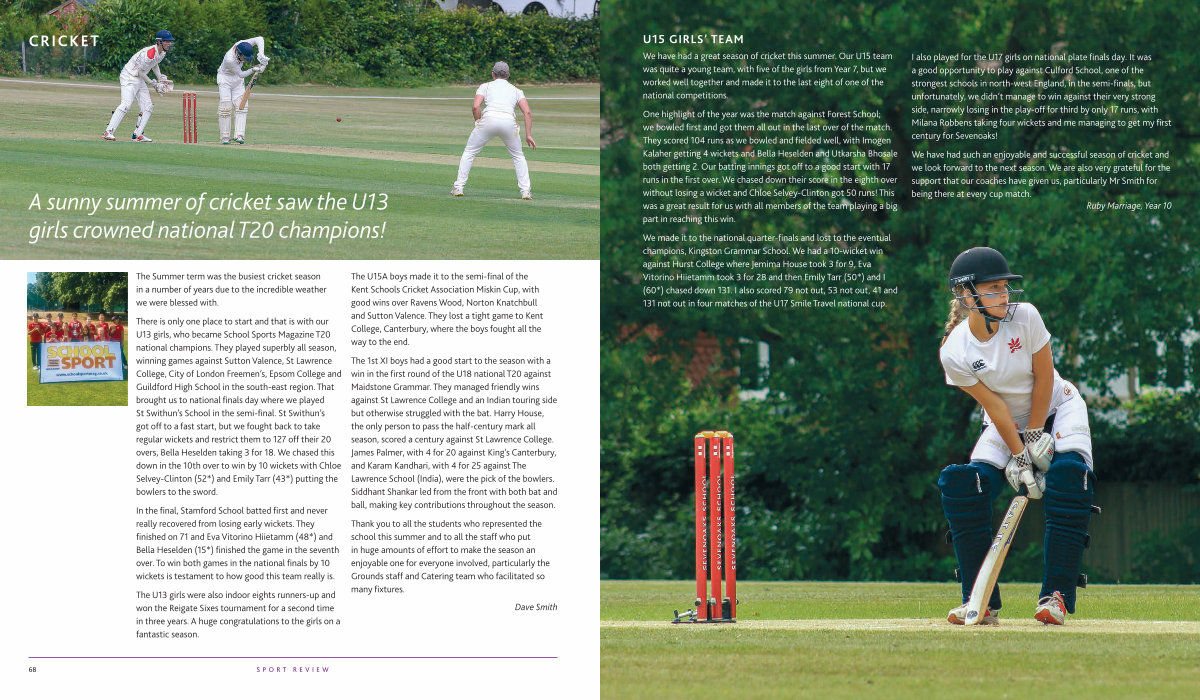 There is only one place to start and that is with our U13 girls, who became School Sports Magazine T20 national champions. They played superbly all season, winning games against Sutton Valence, St Lawrence College, City of London Freemen’ s, Epsom College and Guildford High School in the south-east region. That brought us to national finals day where we played St Swithun’ s School in the semi-final. St Swithun’ s got off to a fast start, but we fought back to take regular wickets and restrict them to 127 off their 20 overs, Bella Heselden taking 3 for 18. We chased this down in the 10th over to win by 10 wickets with Chloe Selvey-Clinton( 52 *) and Emily Tarr( 43 *) putting the bowlers to the sword.