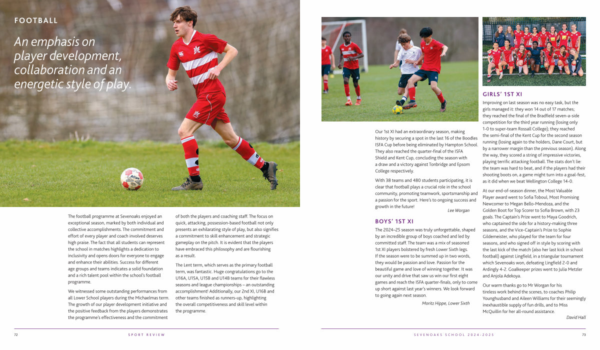 The football programme at Sevenoaks enjoyed an exceptional season, marked by both individual and collective accomplishments. The commitment and effort of every player and coach involved deserves high praise. The fact that all students can represent the school in matches highlights a dedication to inclusivity and opens doors for everyone to engage and enhance their abilities. Success for different age groups and teams indicates a solid foundation and a rich talent pool within the school’ s football programme.
