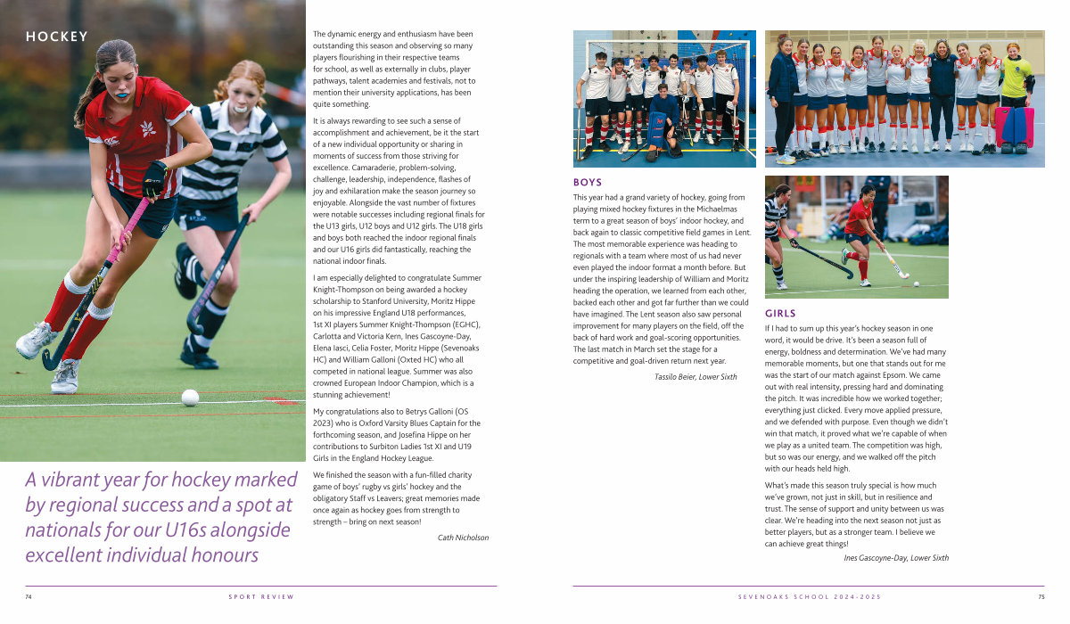 I am especially delighted to congratulate Summer Knight-Thompson on being awarded a hockey scholarship to Stanford University, Moritz Hippe on his impressive England U18 performances, 1st XI players Summer Knight-Thompson( EGHC), Carlotta and Victoria Kern, Ines Gascoyne-Day, Elena Iasci, Celia Foster, Moritz Hippe( Sevenoaks HC) and William Galloni( Oxted HC) who all competed in national league. Summer was also crowned European Indoor Champion, which is a stunning achievement!