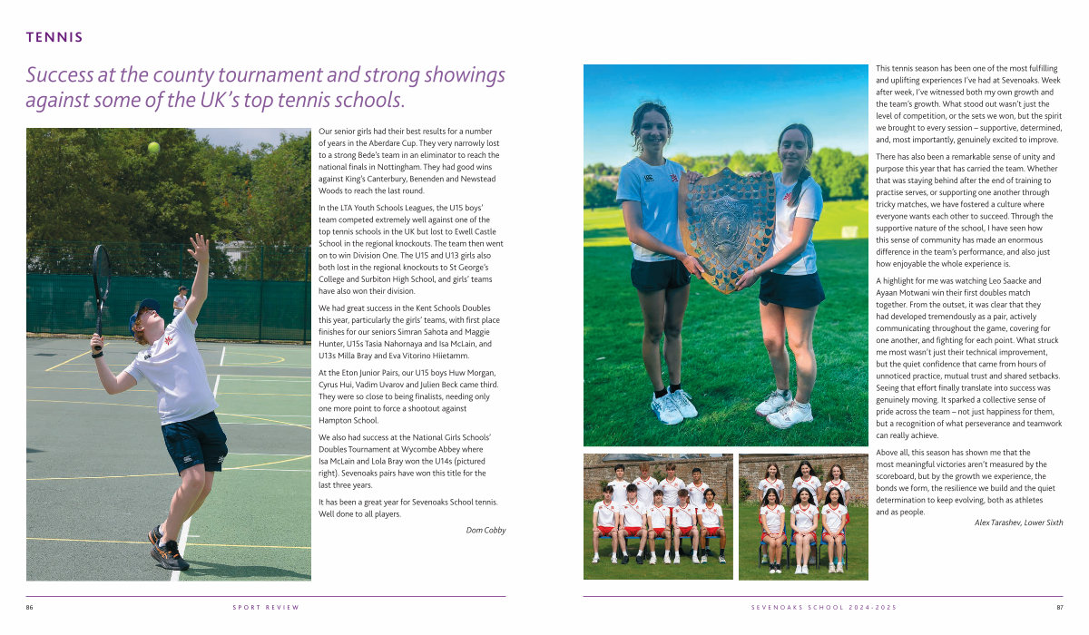 This tennis season has been one of the most fulfilling and uplifting experiences I’ ve had at Sevenoaks. Week after week, I’ ve witnessed both my own growth and the team’ s growth. What stood out wasn’ t just the level of competition, or the sets we won, but the spirit we brought to every session – supportive, determined, and, most importantly, genuinely excited to improve.