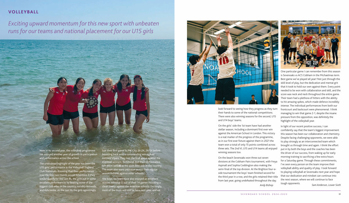 SPORT REVIEW lost their first game to MK City 26-24, 26-24 before bouncing back with a commanding win against Ashfield Vipers. They lost the final game against the eventual winners, Richmond, but their performance left them ranked as the sixth best side in the country. The team also were unbeaten across their regular season fixtures against other schools.