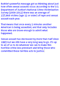 Ruthie's powerful message got us thinking about just how often sexual assaults occur. According to the U.S. Department of Justice's National Crime Victimization Survey (2008-2012) there was an average of 237,868 victims (age 12 or older) of rape and sexual assault each year.