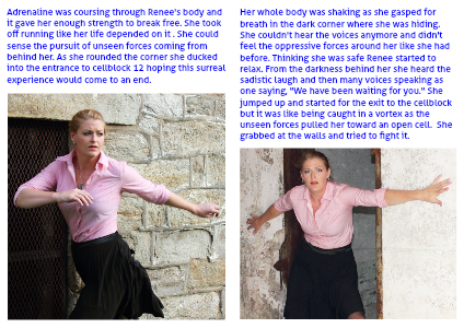 Her whole body was shaking as she gasped for breath in the dark corner where she was hiding. She couldn't hear the voices anymore and didn't feel the oppressive forces around her like she had before. Thinking she was safe Renee started to relax. From the darkness behind her she heard the sadistic laugh and then many voices speaking as one saying, "We have been waiting for you." She jumped up and started for the exit to the cellblock but it was like being caught in a vortex as the unseen forces pulled her toward an open cell. She grabbed at the walls and tried to fight it.