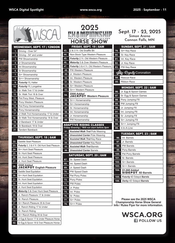 Please see the 2025 WSCA Championship Horse Show General Info / Rules Flyer for more information.