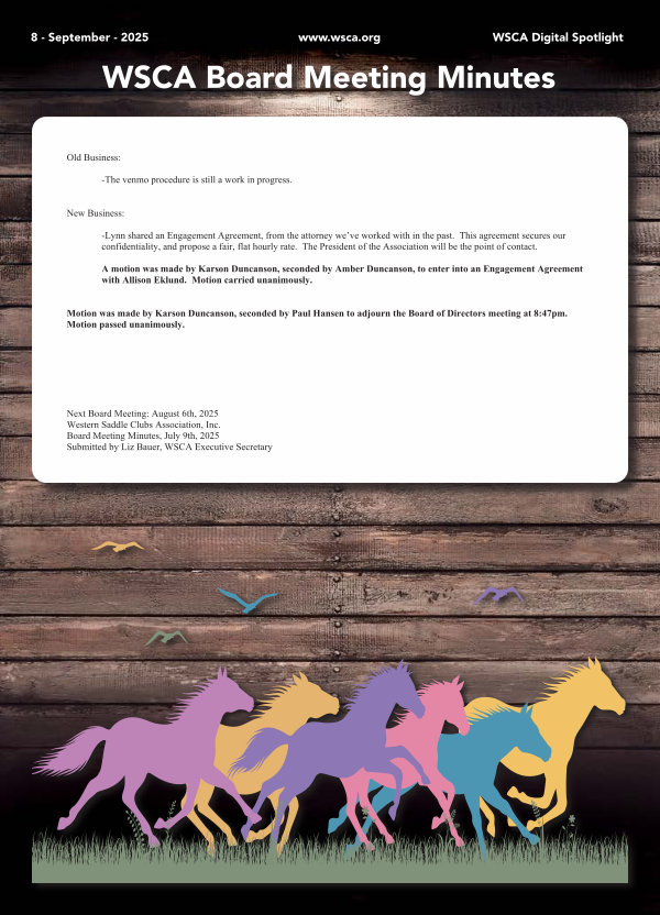 Next Board Meeting: August 6th, 2025 Western Saddle Clubs Association, Inc. Board Meeting Minutes, July 9th, 2025 Submitted by Liz Bauer, WSCA Executive Secretary