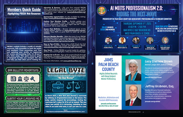 Discover Member Benefits – Make the most of your PBCBA membership! Explore networking opportunities, discounts, and other exclusive perks on the Member Benefits page: www. palmbeachbar. org / member-benefits.