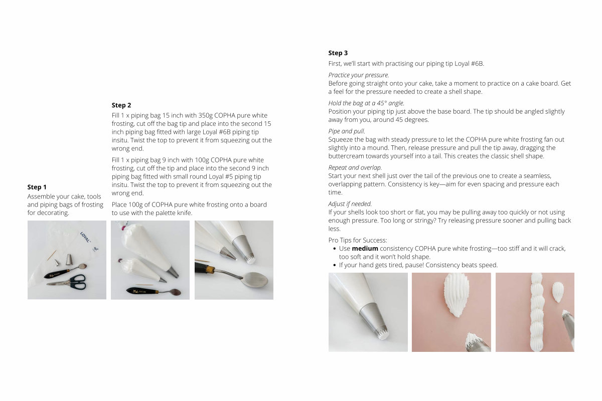 Pro Tips for Success: Use medium consistency COPHA pure white frosting— too stiff and it will crack, too soft and it won’ t hold shape. If your hand gets tired, pause! Consistency beats speed.