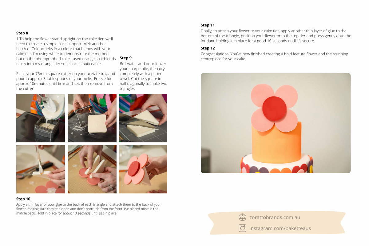Step 8 1. To help the flower stand upright on the cake tier, we’ ll need to create a simple back support. Melt another batch of Colourmelts in a colour that blends with your cake tier. I’ m using white to demonstrate the method, but on the photographed cake I used orange so it blends nicely into my orange tier so it isn’ t as noticeable.