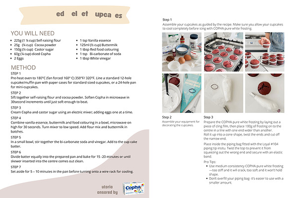 STEP 1 Pre-heat oven to 180 ° C( fan forced 160 ° C) 350 ° F / 320 ° F. Line a standard 12-hole cupcake / muffin pan with paper cases for standard sized cupcakes, or a 24-hole pan for mini-cupcakes.