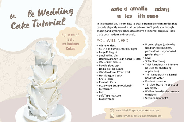 In this tutorial, you’ ll learn how to create dramatic fondant ruffles that cascade elegantly around a tall tiered cake. We’ ll guide you through shaping and layering each fold to achieve a textured, sculptural look that’ s both modern and romantic.