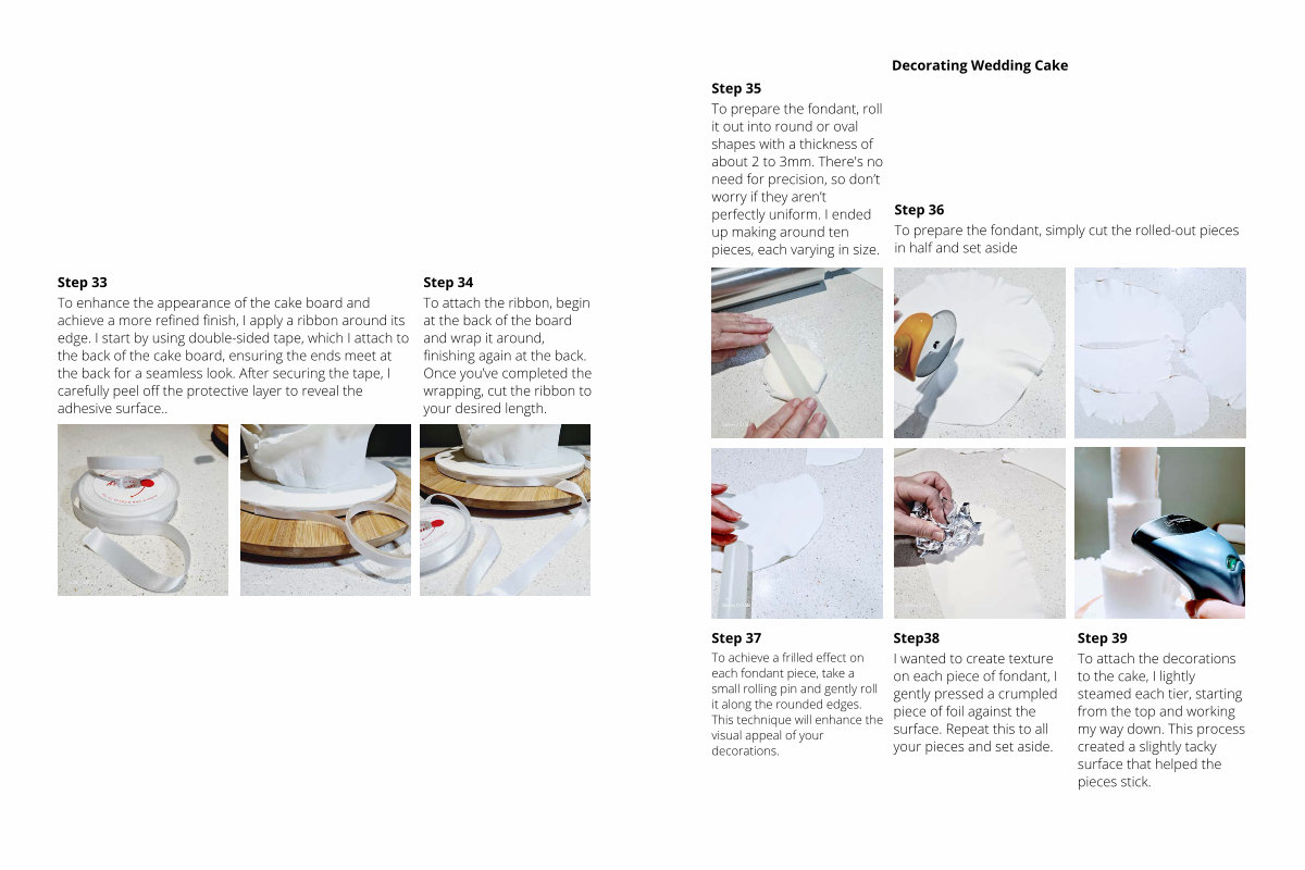 Step 33 Step 34 To enhance the appearance of the cake board and achieve a more refined finish, I apply a ribbon around its edge. I start by using double-sided tape, which I attach to the back of the cake board, ensuring the ends meet at the back for a seamless look. After securing the tape, I carefully peel off the protective layer to reveal the adhesive surface..