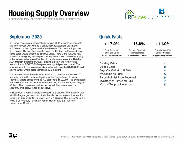 U. S. new-home sales unexpectedly surged 20.5 % month-over-month and 15.4 % year-over-year to a seasonally adjusted annual rate of 800,000 units, the highest level since January 2022, according to the U. S. Census Bureau. Economists polled by Reuters had forecast newhome sales would decline to 650,000 units. There were 490,000 new homes for sale going into September, equivalent to a 7.4-month supply at the current sales pace. For the 12-month period spanning October 2024 through September 2025, Pending Sales in the Hilton Head Association of REALTORS ® region went up 8.4 percent overall. The price range with the largest pending sales gain was the $ 1,000,001 and Above range, where sales increased 17.2 percent.