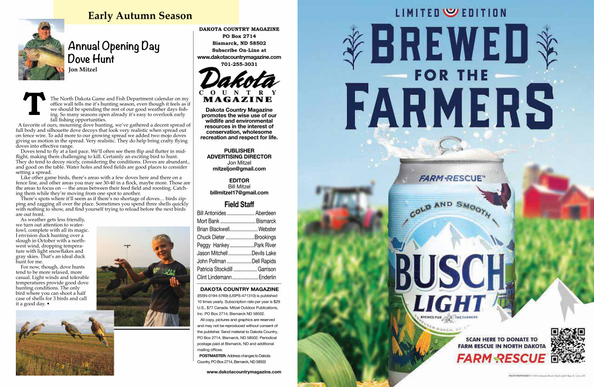 All copy, pictures and graphics are reserved and may not be reproduced without consent of the publisher. Send material to Dakota Country, PO Box 2714, Bismarck, ND 58502. Periodical postage paid at Bismarck, ND and additional mailing offices. POSTMASTER: Address changes to Dakota