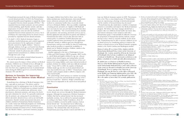 Pennsylvania has a shortage of Medical Assistance dentists , especially in rural areas . This deficit could be addressed in part by making greater use of other medical providers . Children in Pennsylvania see primary medical care providers such as pediatricians , physicians , nurse practitioners , physician assistants , and nurses for checkups and evaluations for school . It is generally understood that the primary care setting may be an ideal place to deliver preventive dental services , such as an oral health assessment , fluoride varnish and parental education , for children enrolled in Pennsylvania Medical Assistance . As a result , many state Medicaid programs are reimbursing physicians , certified registered nurse practitioners or physician assistants for dental services . North Carolina ’ s Into the Mouth of Babes , a preventive dentistry program that targets children from birth to three years of age , 34 utilizes pediatricians , family physicians , nurse practitioners , nurses , physician assistants and other public health workers in community health clinics to provide dental services to Medicaid children . After successfully completing a training period , providers are eligible to bill Medicaid up to six visits for oral care provided during the first three years of a child ’ s life . 35 The covered dental services include : risk assessment , oral screening , prevention services such as fluoride application and education for parents and children . 36 Pennsylvania has taken a step in this direction with its current policy to reimburse enrolled physicians and certified registered nurse practitioners for the application of fluoride varnish to children aged zero through four . Pennsylvania could go even further by directly reimbursing other medical providers to expand the availability of dental care for Medical Assistance children , similar to the North Carolina medical model . Another approach is the state of Washington ’ s Access to Baby and Child Dentistry ( ABCD ) program . ABCD works to : enroll Medicaid-eligible children by age one ; educate families about dental hygiene and eating habits ; provide outreach and case management ; train dentists in best care practices for young children ; and create referral networks of pediatric dentists for children with more difficult treatment needs . 37 From 1997 to 2008 , the number of Medicaid children under age six who received annual dental care more than doubled because of ABCD . 38 Pennsylvania could consider a pilot program similar to ABCD to improve children ’ s dental health . We acknowledge a final option is to continue increasing dental fees to reach the national Medicaid average of 60.5 percent of retail fees . 39 However , budget constraints may cause this to be impossible in the current fiscal and political climate .