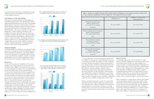 DISCUSSION Our findings support the concept that there is a link between a dentist ’ s willingness to perform procedures and their dental school training . The main finding of our survey was that if a student performed an examination on a child younger than 2 years of age while in dental school , they were more willing to do so upon graduation . In spite of the guidelines established by the AAPD , a majority of graduating dental students in Pennsylvania do not feel prepared to follow these recommendations . Furthermore , less than half of the dental students could identify 12 months as the recommended age for the first dental exam .