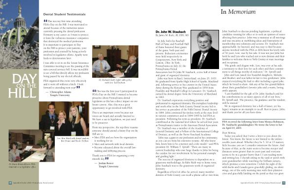 “ John was a giant in our profession and in his community , as you can see from his extensive resume . All who knew him , knew him to be a mentor and a role model ,” said PDA president Dr . William T . Spruill . “ There are many in current leadership who owe huge thanks to John for being the catalyst for our involvement by his personal example and guiding light .” The success of organized dentistry is dependent on a grassroots methodology . As Babe Ruth was to home runs , John Staubach was to the grassroots work of organized dentistry . Regardless of level of office he served , many member dentists of York County can recall a phone call or visit from