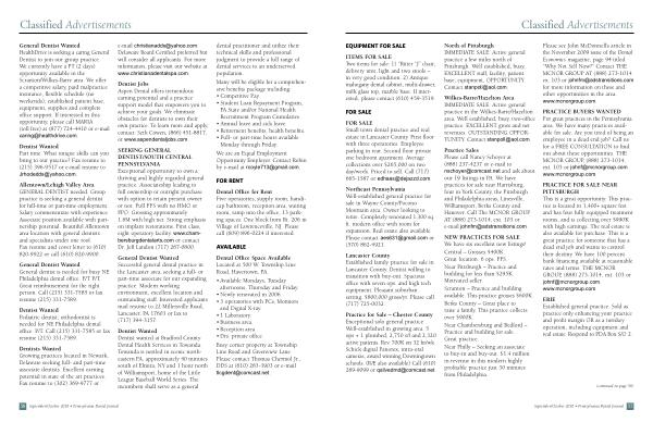 SEEKING GENERAL DENTIST / SOUTH CENTRAL PENNSYLVANIA Exceptional opportunity to own a thriving and highly regarded general practice . Associateship leading to full ownership or outright purchase with option to retain present owner or not . Full FFS with no HMO or PPO . Grossing approximately 1.6M with high net . Strong emphasis on implant restorations . First class , eight operatory facility . www . chambersburgdentalarts . com or contact Dr . Jeff Landon ( 717 ) 267-0800 .