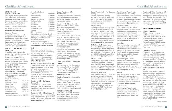 Dental Practice Sale – Northampton County General , freestanding building w / 1,600 s / f , 4 new Adec ops + add ’ l ops ., 2,000 active pts . Rev . $ 1.2M . Contact Donna at ( 800 ) 968-5674 . www . snydergroup . net .