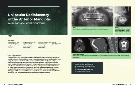 Panoramic radiograph showing a unilocular radiolucency of the anterior mandible with scalloping borders.