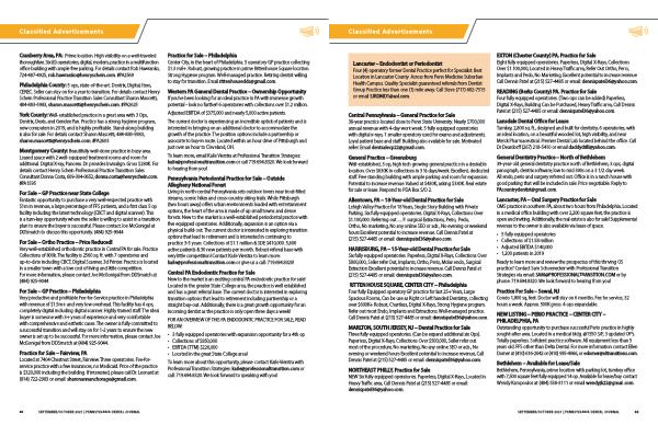 Practice for Sale – Philadelphia Center City , in the heart of Philadelphia . 5 operatory GP practice collecting $ 1.3 mil +. Robust , growing practice in prime Rittenhouse Square location . Strong Hygiene program . Well-managed practice . Retiring dentist willing to stay for transition . Email rittenhousedds @ gmail . com .