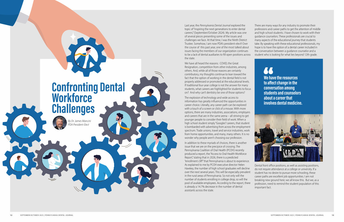 Last year, the Pennsylvania Dental Journal explored the topic of“ inspiring the next generations to enter dental careers,”( September / October 2024). My article was one of several pieces presenting some of the issues and challenges we face. At that time, I was the Ninth District Trustee. Somehow, I am now PDA’ s president-elect! Over the course of this past year, one of the most talked about issues facing the members of our organization continues to be a lack of dental auxiliaries to fill open positions across the state.