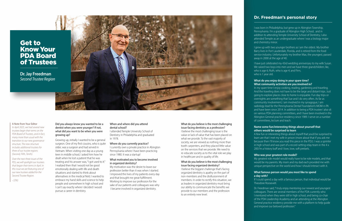 Dr. Freedman said,“ I truly enjoy mentoring our newest and youngest colleagues. There are several members of the PDA currently who I mentored when they were still in high school, and being co-chair of the PDA Leadership Academy and an attending at the Abington General practice residency provide me with a platform to help guide and improve our beloved profession.”