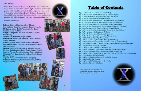 Pg . 1 : Letter From The Editors and Issue 10 Staff Pg . 2 : How To Stay Organized In School by Venize Catapang Pg . 2 : Top 10 Christmas Things To Do by Joel S . and Axel V . Pg . 3 : How to Roller Skate by Saeha Jayasuriya Pg . 4 : How to Make Homemade Ice Cream by Angela Sanchez Peraza Pg . 4 : Description Article on Volleyball by Angela Sanchez Peraza Pg . 5 : How to Make Gummy Bears by Anjeliett Esmeralda Padilla Pg . 5 : How to Spot Easter Eggs in Movies , Games , or Books by JP Smith Pg . 6 : ( An Introduction to ) Trumpets by Axel Vasquez Medina Pg . 6 : How to get Good at Basketball , For Beginners by Ben Cilibrasi Pg . 7 : How to Make a ( Fake ) Leak by JP Smith Pg . 8 : How To Ride A Ripstik by Alexandr Anisimov Pg . 9 : How To Better Enjoy Disneyland by Julianna Sheehy Pg . 10 : Shrek Meets Peppa Pig Word Search Pg . 11 : How To Make English Muffin Pizza by Mina Motley Pg . 11 : Book Review on Harry Potter Sorcerer ’ s Stone by Julianna Sheehy Pg . 12 : HALLOWEEN KILLS WAS GARBAGE ( Movie Review ) by Sanjay Velappan Pg . 12 : Winter Word Search by Eimon Lei Pg . 13 : How To Make Lasagna by Diego Terriquez Pg . 14 : How to Get The Creases Out of Your Shoes by Guianna Salcedo Pg . 14 : Why is Ballet Good For Us by Anjeliett Esmeralda Padilla Pg . 15 : How to Take Care of Type 3C Hair ( Very Curly to Coily Hair ) by Jordan Santana Pg . 15 : Silver Skates Movie Review by Pg . 16 : How to Make Enchiladas by Bryan Sotelo Aragon Pg . 16 : Roblox by Axel Vasquez Pg . 17 : How to Hold a Violin Bow by Rey Fischer Pg . 18 : Zodiac Signs by Nikki Barry