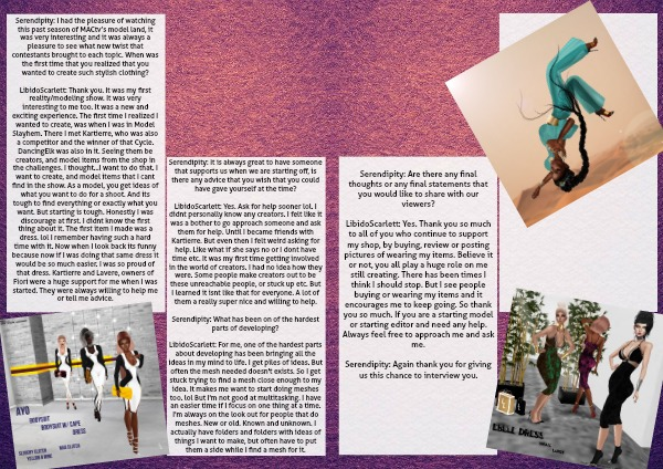 LibidoScarlett: Thank you. It was my first reality/modeling show. It was very interesting to me too. It was a new and exciting experience. The first time I realized I wanted to create, was when I was in Model Slayhem. There I met Kartierre, who was also a competitor and the winner of that Cycle. DancingElk was also in it. Seeing them be creators, and model items from the shop in the challenges. I thought...I want to do that. I want to create, and model items that I cant find in the show. As a model, you get ideas of what you want to do for a shoot. And its tough to find everything or exactly what you want. But starting is tough. Honestly I was discourage at first. I didnt know the first thing about it. The first item I made was a dress. lol I remember having such a hard time with it. Now when I look back its funny because now if I was doing that same dress it would be so much easier. I was so proud of that dress. Kartierre and Lavere, owners of Fiori were a huge support for me when I was started. They were always willing to help me or tell me advice.