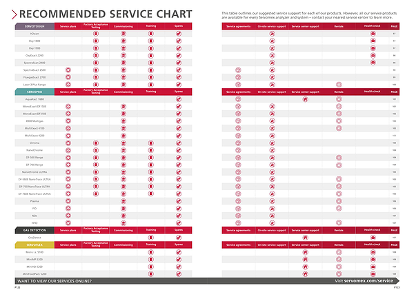 SERVOTOUGH Service plans Factory Acceptance Testing Commissioning Training Spares H H2scan Oxy 1800 Oxy 1900 OxyExact 2200 SpectraScan 2400 SpectraExact 2500 FluegasExact 2700 Laser 3 Plus Range SERVOPRO Service plans Factory Acceptance Testing Commissioning Training Spares AquaXact 1688 MonoExact DF150E MonoExact DF310E 4900 Multigas MultiExact 4100 MultiExact 4200 Chroma NanoChrome DF-500 Range DF-700 Range NanoChrome ULTRA DF-560E NanoTrace ULTRA DF-750 NanoTrace ULTRA DF-760E NanoTrace ULTRA Plasma FID NOx HFID GAS DETECTION Service plans Factory Acceptance Testing Commissioning Training Spares H OxyDetect SERVOFLEX Service plans Factory Acceptance Testing Commissioning Training Spares Micro i . s . 5100 MiniMP 5200 MiniHD 5200 MiniFoodPack 5200 RECOMMENDED SERVICE CHART WANT TO VIEW OUR SERVICES ONLINE ? P122