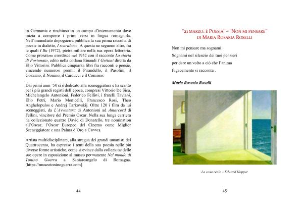 Artista multidisciplinare , alla stregua dei grandi umanisti del Quattrocento , ha espresso i temi della sua poesia nelle più diverse forme artistiche , come si evince dalla collezione delle sue opere in esposizione al museo permanente Nel mondo di Tonino Guerra a Santarcangelo di Romagna . [ https :// museotoninoguerra . com ]