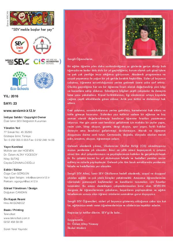 Sevgili SEV Ailesi, İzmir SEV Okullarının hedefi akademik, sosyal ve duygusal yönden sağlıklı ve çok yönlü bireyler yetiştirmektir. Amacımız öğrencilerimize içlerindeki potansiyeli keşfetmeleri ve kendilerini tanımaları için fırsatlar tanımaktır. Bu amacı destekleyen çalışmalarımızdan birisi olan SEVECEN dergimiz ile öğrencilerimizin çabalarını, başarılarını paylaşmaktan ve eğitim felsefemizin sonucu olan öğrenci ürünlerini sunmaktan gurur duyuyoruz. $