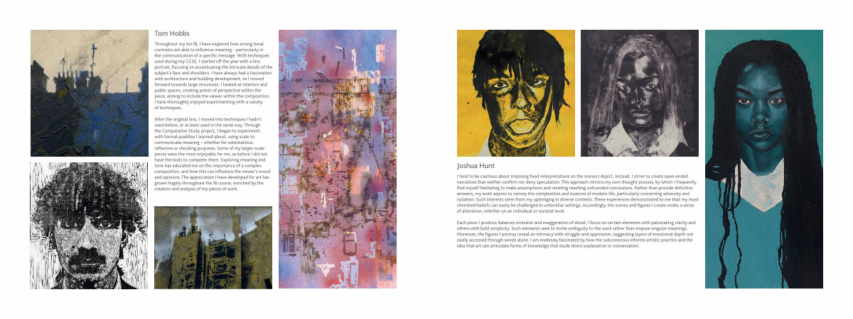 Throughout my Art IB , I have explored how strong tonal contrasts are able to influence meaning – particularly in the communication of a specific message . With techniques used during my GCSE , I started off the year with a lino portrait , focusing on accentuating the intricate details of the subject ’ s face and shoulders . I have always had a fascination with architecture and building development , so I moved forward towards large structures . I looked at interiors and public spaces , creating points of perspective within the piece , aiming to include the viewer within the composition . I have thoroughly enjoyed experimenting with a variety of techniques .