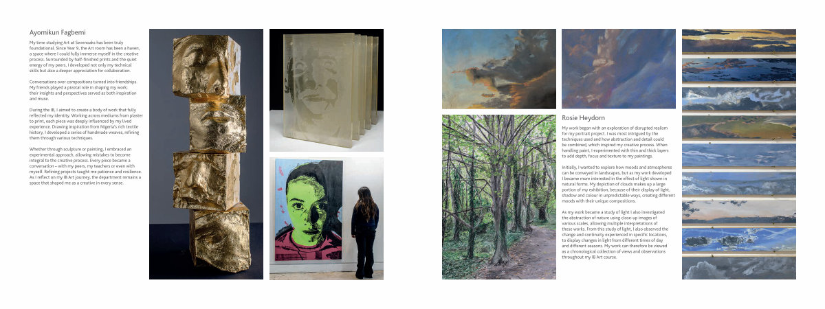 As my work became a study of light I also investigated the abstraction of nature using close-up images of various scales , allowing multiple interpretations of these works . From this study of light , I also observed the change and continuity experienced in specific locations , to display changes in light from different times of day and different seasons . My work can therefore be viewed as a chronological collection of views and observations throughout my IB Art course .